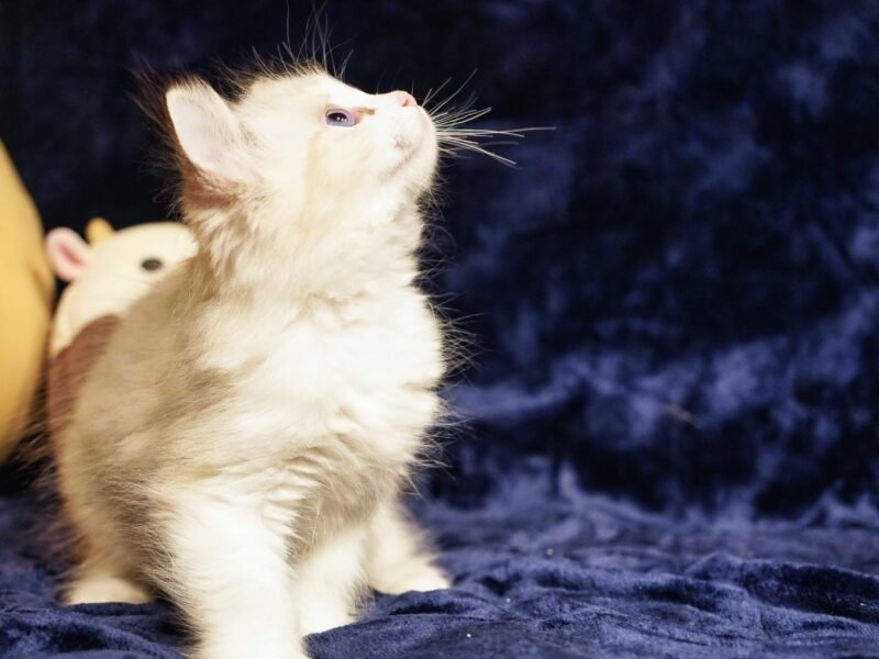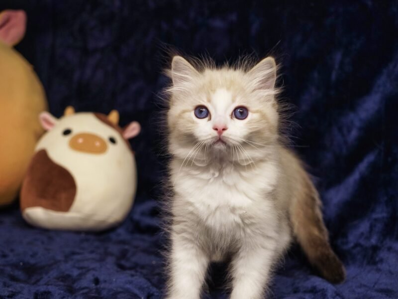CJ is a Minx Lynx Mitted Ragdoll kitten. He has the signature striking blue eyes of the Ragdoll breed, with the “Lynx” pattern, giving him darker tabby markings on his face, ears, legs, and tail. His coat is silky and semi-long, with the “mittens” of white fur on his paws and a white blaze on his chest. CJ’s overall look is a combination of soft, wild beauty from the lynx-patterned markings, and the classic, soft Ragdoll gentleness in his structure and expression.